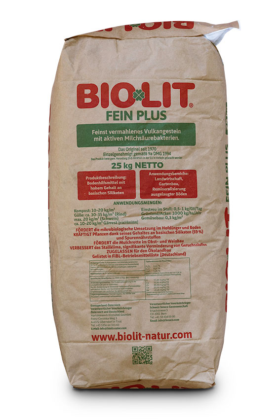 BIOLIT: Das Biolit-Logo steht für vermahlene Vulkangesteinsmehle aus dem Hartsteinwerk Kitzbühel. Der einzigartige Produktvorteil von Biolit besteht in der gleichbleibend garantierten Mahlfeinheit 90% < 80my, den beimpften, bioaktiven Mikroorganismen und im besonders hohen Chloritgehalt, dessen paramagnetische Wirkung den Ionenfluß verbessert. Der Anteil an Chloriten ist im Hartsteinwerk weitaus höher als in sonstigen Diabas- oder Basalsteinbrüchen und zeichnet daher für die besondere Qualität des BIOLIT auch verantwortlich.
